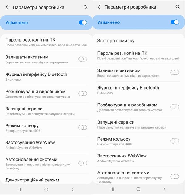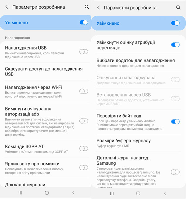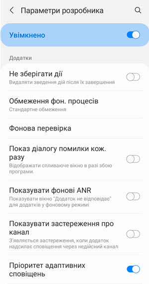 - Налагодження по USB: увімкнути/вимкнути режим налагодження з ПК (можна активувати після приєднання до комп'ютера через USB-кабель).