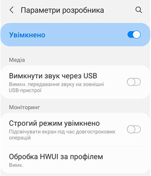 Налаштування розробника виставляються згідно вимог і складаються з різних розділів, які також діляться на підрозділи: