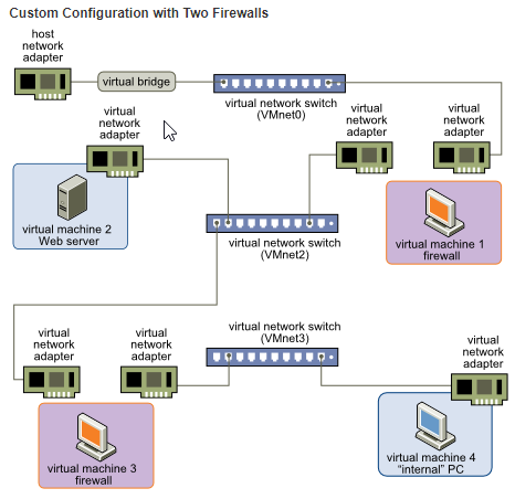 Програма VMware створює всілякі поєднання віртуальних пристроїв, що працюють за різними принципами мережевого взаємодії. Базисом в цьому є віртуальний комутатор, який, як і фізичний пристрій, забезпечує з'єднання компонентів. У нього є порти, до яких можна прив'язати мережеві адаптери абстрактних машин та інші елементи в межах даного хоста. Кілька комп'ютерів, підключених до одного пристрою, належать одній підмережі.
