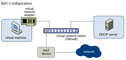 Цей вид взаємодії має на увазі, що власна IP-адреса в Інтернеті у віртуальної машини відсутня. Замість цього в хост-системі створюється окрема локальна мережа. В налаштуваннях за замовчуванням абстрактний комп'ютер отримує адресу в цій приватній мережі від віртуального DHCP-сервера. Емулюватися машина і хост-система мають в загальну мережеву ідентифікацію, яку не видно у зовнішніх ресурсах. Коли встановлюється робоча станція в хост Windows або Linux, налаштовується мережа NAT (VMnet8).